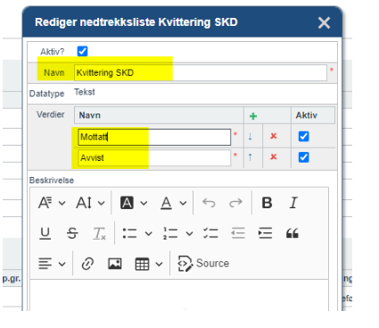 NB! kravet må være satt opp som type tekst, og ha oppsettet med nedtrekksliste. Nedtrekkslisten må ha følgende svaralternativer: (kopier og lim inn så det blir i samsvar - uten anførselstegn) (se bilde 1)