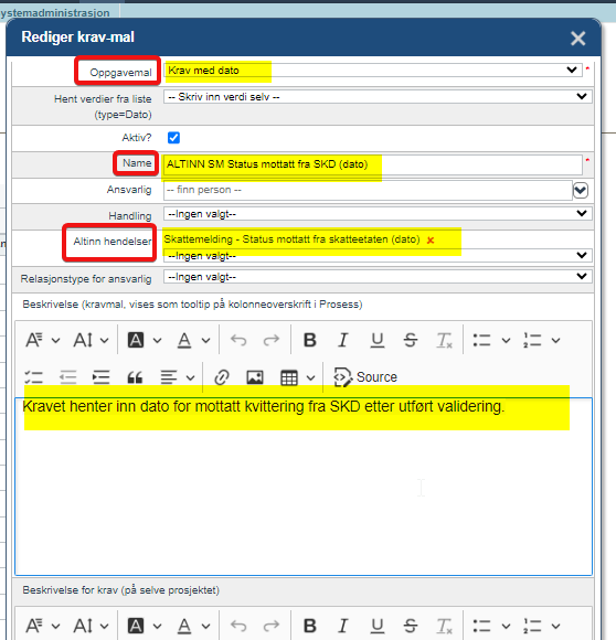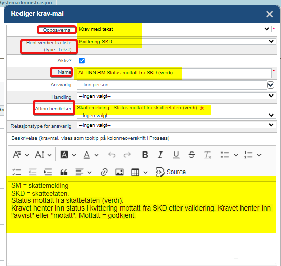 - Altinn SM status mottatt fra SKD (verd); krav i prosess kobles til Altinn-hendelsen: "status mottatt fra skattetaten (verdi)" - kravet henter inn status fra mottatt kvittering fra SKD etter validering. Kravet henter inn "avvist" eller "motatt". Mottatt = godkjent.