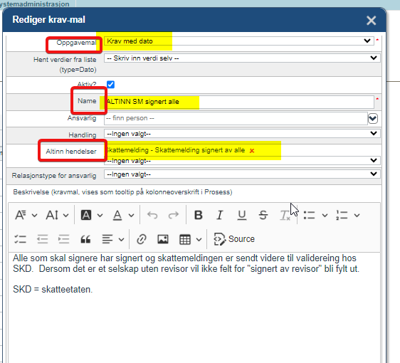 - Altinn SM signert av alle; krav i prosess kobles til Altinn-hendelsen: "skattemelding signert av alle" - alle som skal signere har signert og skattemeldingen er sendt videre til validereing hos SKD. Dersom det er et selskap uten revisor vil ikke felt for "signert av revisor" bli fylt ut.