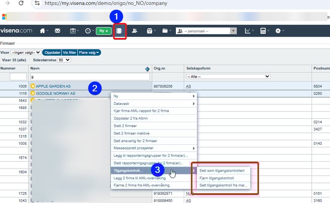 I firmalisten kan du oppdatere firmaer med tilgangskontroll basert på deres firma-mal. (Dette kan kun utføres av brukere med visena-admin-rettighet).