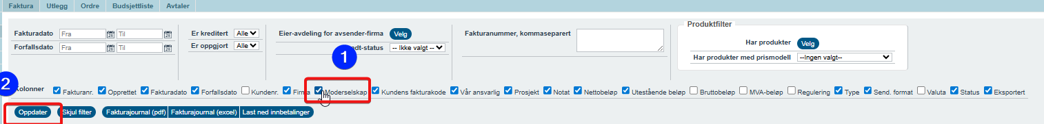 Kolonne for moderselskap kan skrus på i fakturalisten