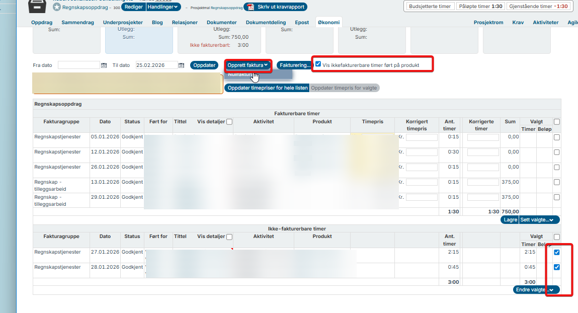- Marker i velg kolonnen for ønsket prosjekt og fakturer (som for nullfakturering av fakturerbare timer)