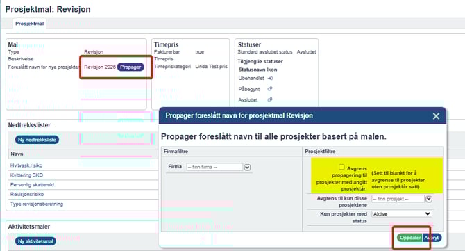 - Klikk på propager (betyr oppdatering av eksisterende prosjekter).